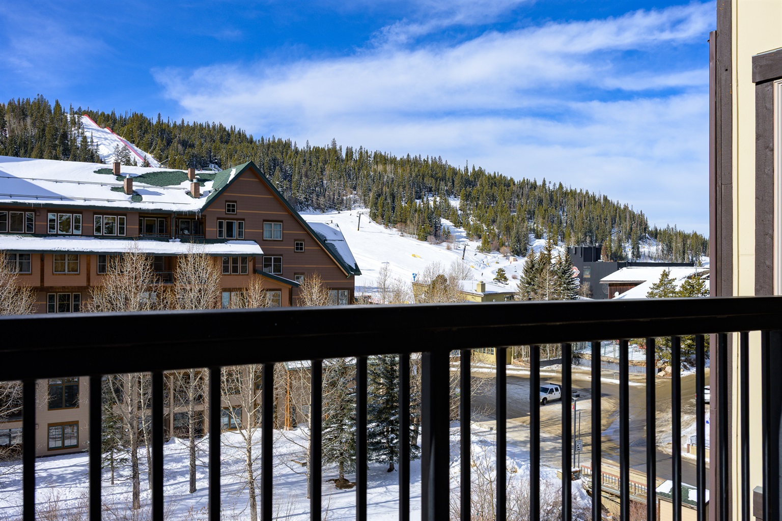 Condo as seen from slopes, is highest deck on right side of tan building