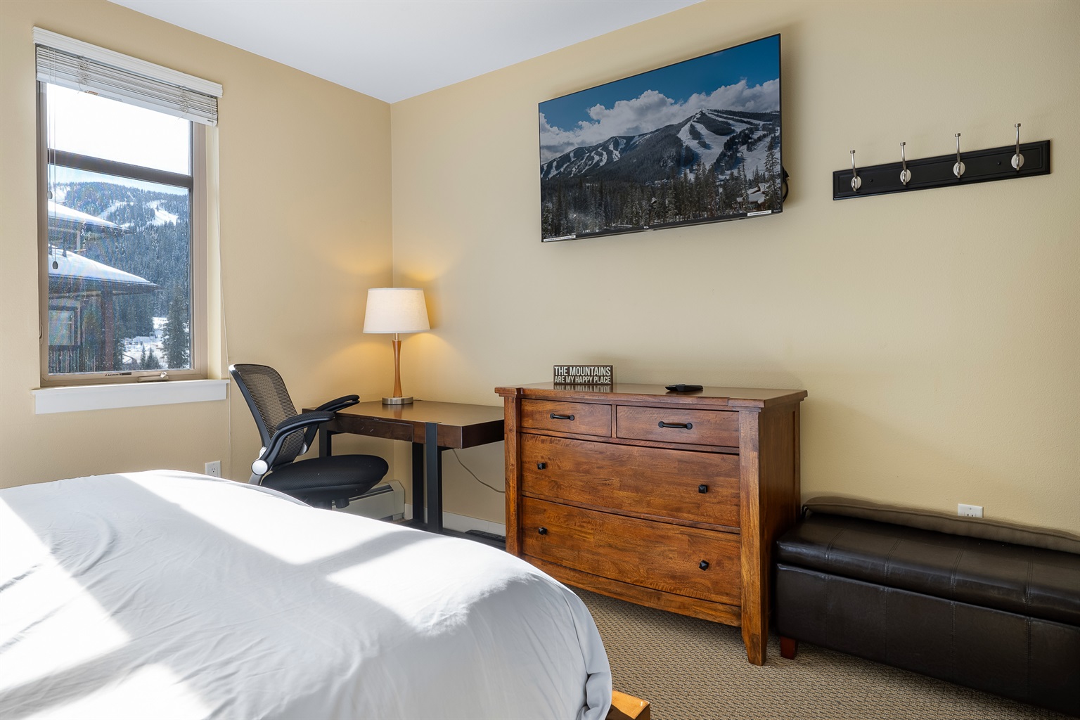 Wall mounted Roku TV, medium sized dresser and comfortable chair/desk with powerstrip on floor if you need to work on a laptop. Coat hooks near door for hanging stuff.