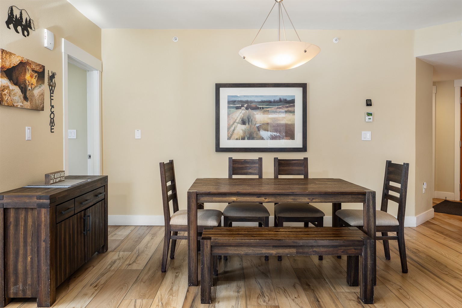 Dining table has 4 chairs and a bench seat